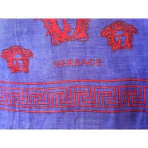 NWT VERSACE Medusa Head Scarf Royal Blue and Ruby Red Print Key Design Elements: