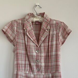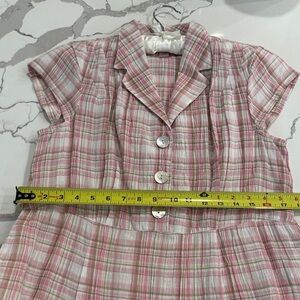 Charming Dress by April Cornell. Features working front buttons and notched collar. Roomy xs fits more like a Small. Gauze fabric, cap sleeves, pockets and adjustable sizing with buttoned/removable back belt.