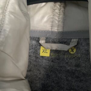 Stylish puffer jacket with a metallic body and gray sleeves. Ideal for warmth and fashion.