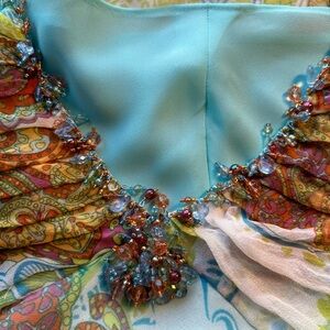 This vibrant Y2K paisley halter top features a stunning blend of colors. Lined in blue. Gathers at bust. Size large