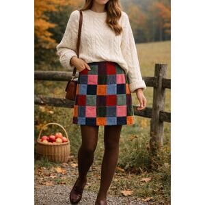 A beautifully crafted Ralph Lauren patchwork mini skirt made from soft cotton corduroy in a rich, quilt-style mix of fall tones. This piece has a charming vintage feel with a timeless preppy silhouette, perfect for cottagecore, academic, or heritage Americana styling. An easy statement skirt that pairs effortlessly with chunky knits, tights, and boots.