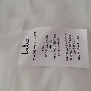 Shell: 100% Cotton. Lining: 95% Polyester, 5% Spandex. • Hand Wash Cold. Do Not Bleach. Hang Or Line Dry. Low Iron lf Needed. • Imported. .• Lined.