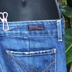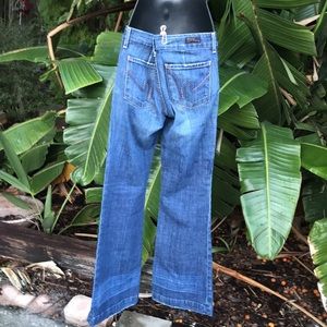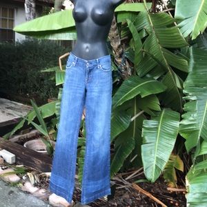 A medium wash denim with some distressing particularly around the hem. Made low waist and wide leg in excellent condition