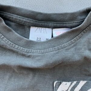 Size 2-3T. Dark grey tee with zebra print pocket. Has slight watermark as shown and some wash wear.