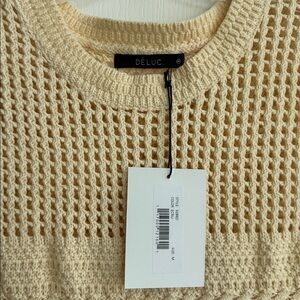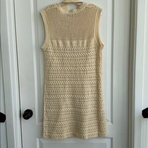 Elegant sleeveless knit dress in a soft cream color. Perfect for casual outings or a cozy day indoors. NWT, new with tag Cotton blend sleeveless knitted midi dress with round collar. Detachable belt. Open work knit Fit: relaxed Model is 175cm / 5'9"" wearing size S. 60% COTTON 40% ACRYLIC Color: ECRU Length approximately 38 inches Pit to pit approximately 18 inches with stretch Need a slip underneath Smoke free, pet free home 10