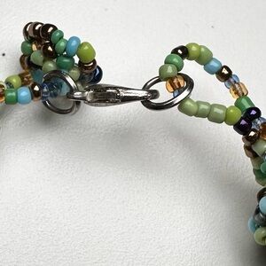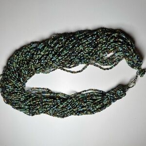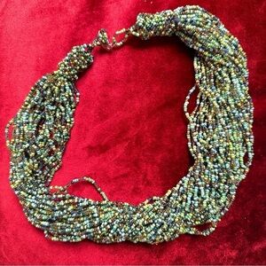 Add a pop of color to your outfit with this beautiful Multi Strand Glass Seed Bead Necklace. The necklace features a stunning combination of green, blue, and bronze beads, making it a perfect statement piece for any occasion. The necklace is handmade and has a lobster claw closure added to the original bead closure.