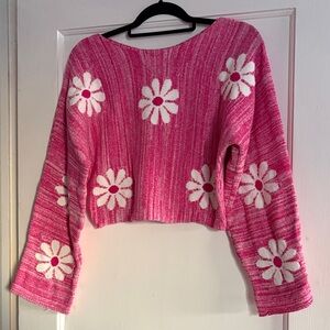 Chic pink sweater with white floral design. Perfect for casual outings.