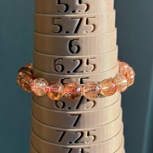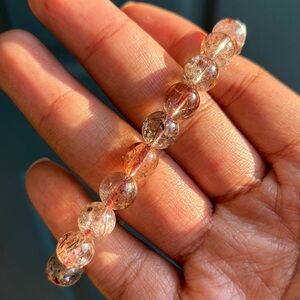Absolutely stunning, high quality, Red Rutilated Quartz gemstone bracelet! Rutilated Quartz is a type of Clear Quartz that contains needle-like inclusions that are caused by titanium dioxide! Rutile with red or copper colors are specifically due to iron oxide inclusions that turn the Rutile red! This piece is high quality with great clarity and big red Rutile inclusions. Some beads also have small pieces of black mica inside the Quartz. This quality of Rutile gets harder to find as time goes on, so I’m excited to present this one to you all!