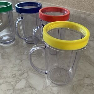 The product is a set of four Magic Bullet replacement cups with handles and colored lip rings. The colorful rings add a fun and vibrant touch to the cups, making them visually appealing. This lot of replacement cups is ideal for those who want to customize their Magic Bullet blender experience with different colors and handle options.