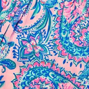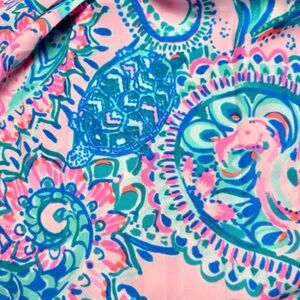 Bright top by Lilly Pulitzer. Features pink and blue tropical patterns. Ideal for sunny days.