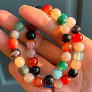 These Agate beads have a unique rondelle shape that is commonly called “old mine” shape! Every bead is different - some with banding and others with multiple colors in one bead. This gemstone bracelet is such an eye catcher with lots of character!