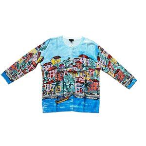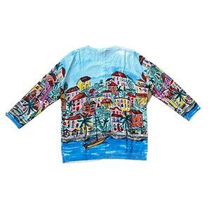 A wearable painting — vibrant coastal village print with stunning detail. Measures are in the pictures.