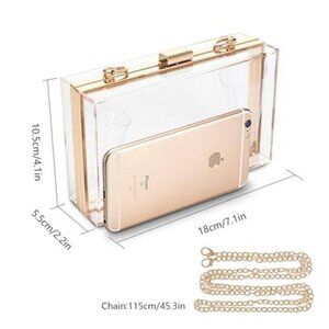 *This transparent box clutch bag size a is 7.1" x 4.1" x 2.2" and weighs only about 0.88 lbs, this delicate interior can accommodate some phones with screens under 6 inches and even your sunglasses, lipstick and more items.