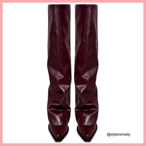 A stylish boot featuring a fold-over design and pointed toe, crafted for a chic look suitable for all seasons. The wide calf fit and knee-high style offer versatile pairing with tight jeans and dresses for a variety of outfits.
