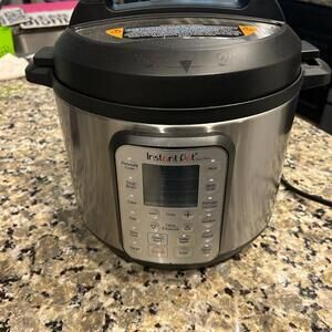 Stainless steel Instant Pot Duo Plus with digital display. Features multiple cooking settings. Used one time to test it, almost new.