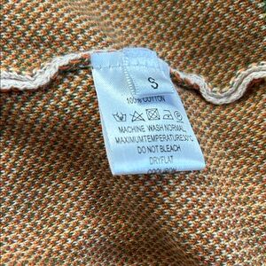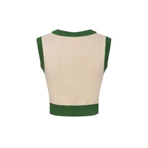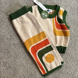 Stylish two-piece set with geometric patterns. Features green, orange, and cream colors.