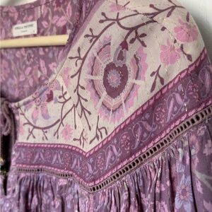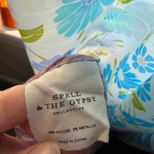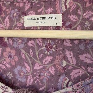 This stunning Dahlia Blouse in Mulberry by Spell is a true gem for collectors and Spell lovers. Crafted from a luxurious fabric blend, it features a beautiful gold metallic thread woven throughout the fabric, adding a touch of sparkle to its multiple gorgeous prints. The blouse is in excellent condition, perfect for adding to your collection. With charming neck ties and cute tassels, this blouse exudes bohemian elegance. Size S but can fit up to a L depending on desired fit.