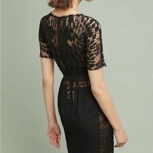 Anthropologie Chic black lace Carissima Sheath dress with short sleeves and a stylish belt. Perfect for evening events.