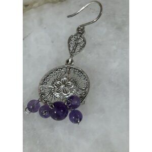 Silver Tone Filigree Dangle Earrings Purple Bead Boho Vintage Style
