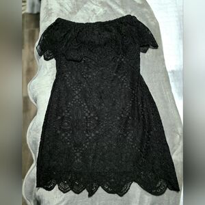 This elegant black lace dress features a strapless design, perfect for any special occasion. The intricate lace pattern adds a touch of sophistication and style.