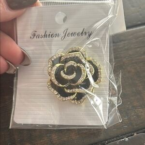 This exquisite brooch features a detailed rose design in black and gold, adorned with shimmering stones that highlight its elegant contours. The intricate craftsmanship and luxurious appearance make it a standout accessory for any occasion.