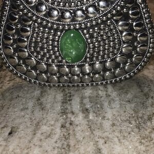 This stylish clutch features a striking black and green design, perfect for adding flair to any outfit. Its studded detail offers a modern touch.