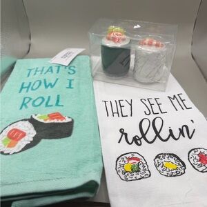 Sushi themed kitchen set includes 2 kitchen towels and salt and pepper shaker set. NWT.