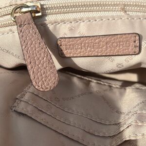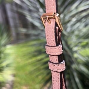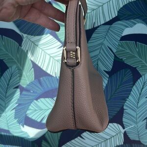 Pebbled leather fawn crossbody. Almost looks slightly blush / tint of pink to me, some lighting it looks taupe colored. See pictures and video. ( indoors and outdoors ) Pre owned, minor flaws from wear. Good condition. Some light staining to inner. Gold hardware. Zip closure. Approx measurements - 9"(W) × 6.5"(H) × 3.5"(D) about a 23” drop.