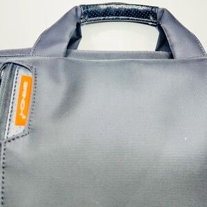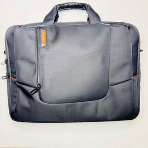 In good preowned condition only missing the shoulder strap. Sleek black laptop bag with vibrant orange details. Ideal for business travel.