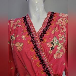 With embroidered touches and delicate beading along the neck and hem, this radiant, wrap-inspired mini showcases all of our favorite florals for spring.
