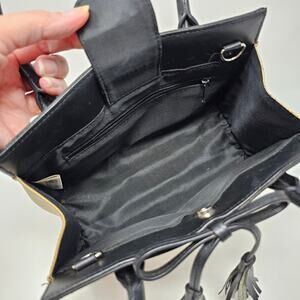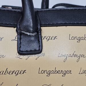 Mini top handle satchel Longaberger purse with Longaberger script in varying fonts all over. Black tassel accents and heart appliques. This purse has one snap close main compartment with one inside zip pocket. It is in good preowned condition overall but NOTE: it appears that one small applique is missing from the front and the handles are cracked at the base (cosmetic) - see photos.