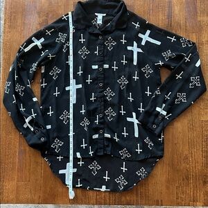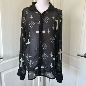 Marisol edgy Goth rock, sheer blouse cross design, black white top women’s large