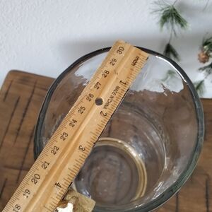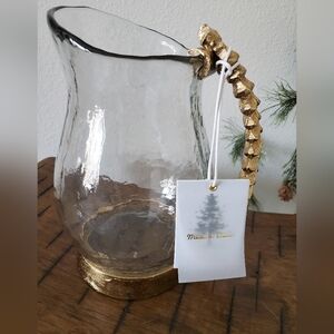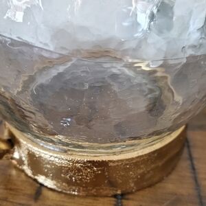 Crafted from hammered-style glass with a base and handle made of gold-tone metal. This is heavy thick glass. It weighs 2.5lbs.