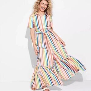 Target Pride Button-Front Tie Waist Maxi Shirtdress Rainbow Stripe Dress Sz S