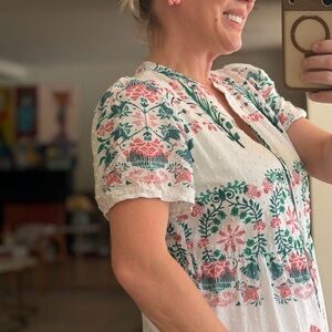 Anthropologie Kindred Size Medium White Green Pink Embroidered Floral Midi Dress. It’s so very beautiful and feminine. Cotton lined feminine beauty. Non smoking home. Charming floral midi dress by Anthropologie. Features a white base with green and pink floral patterns. Perfect for any occasion. One arm band has looser elastic than the other. I’d remove in general.