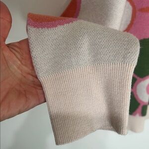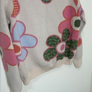 It's a colorful, long-sleeved crewneck top with bold, retro-inspired floral knit design in shades of pink, blue, and green on a cream base.