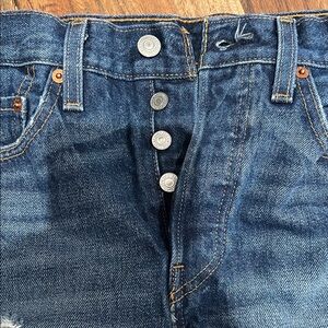 Trendy Levi's jean shorts with a distressed look. Perfect for casual wear. EUC button fly! 501s these never go out of style these are the perfect casual shorts!