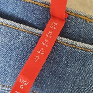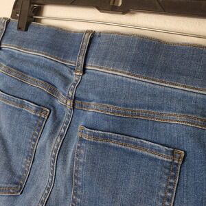 High-rise flare jeans in a medium wash denim offer a flattering pull-on design with a hidden core-shaping panel. Constructed from premium stretch denim, these pants feature functional back pockets, faux front pockets, and a classic flared leg silhouette for a timeless look. The comfortable elasticized waistband ensures a smooth fit without the bulk of a traditional zipper or button fly. The Spanx size Large jeans are made for a women's 10 / 12.