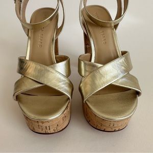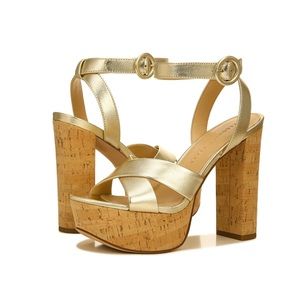 NEW NIB Veronica Beard Lalana Metallic Leather Crisscross Band Vamp & Ankle Strap Cork Platform & Chunky Block Heel Sandal in Metallic Gold, Size 6.5M