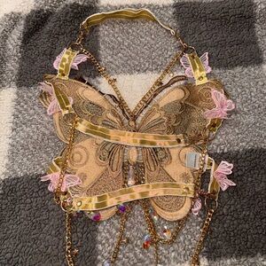 Rave butterfly embellished top and matching garter! Featuring intricate designs in brown, pink, and gold chains - worn once to a festival