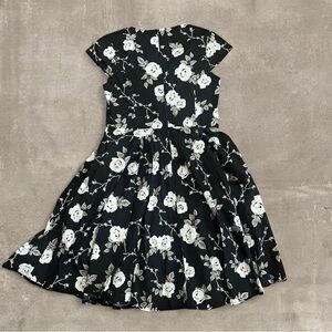 Hell Bunny Vixen Natalia Rose retro rockabilly swing dress featuring a black background with a white rose floral print and a sweetheart neckline.
