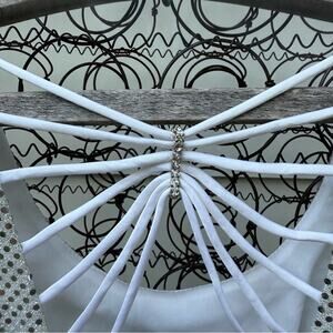 Scoop back with a web and rhinestone upper back detail