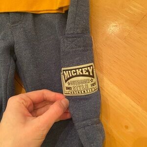 Kids outfit set featuring a mustard yellow space-themed sweatshirt, a blue and white plaid hoodie, navy shorts, and blue pants. Includes vintage Mickey pants