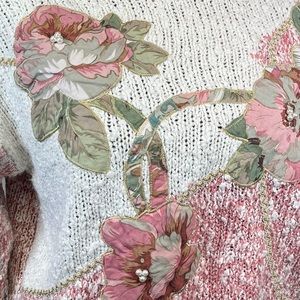 Vintage Creamy White/Pink Floral Appliqué Chunky Knit Sweater Large