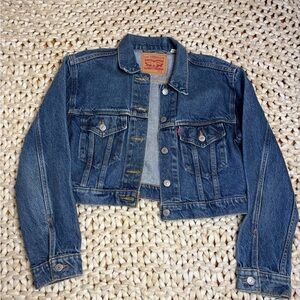 Levi's denim jacket in classic blue. Features button front and chest pockets. Ideal for everyday style.