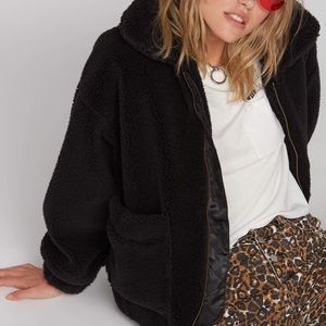 Give your fall wardrobe a fuzzy style boost. This cozy coat is an oversized, soft sherpa fabric jacket with polyester satin lining. Model is wearing size small.
