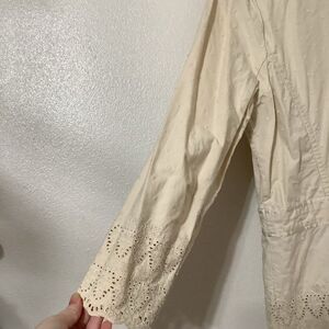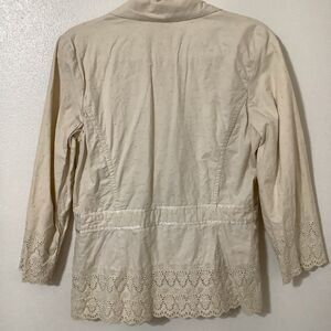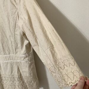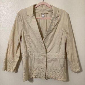 Old Navy Brand Vintage Y2K Boho Chic Bohemian Cottagecore Aesthetic Feminine Whimsical Cream Eyelet Lace Cutout Embroidered Polka Dot Blazer Jacket with Scalloped Hem and Multicolor Beaded and Buttons Details. Good condition-some wear on hems, loose threads, dots, pinhole as pictured. Size L. 100% Cotton. Fall 2005.