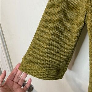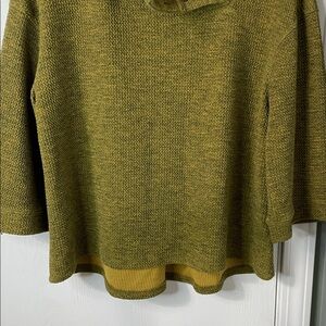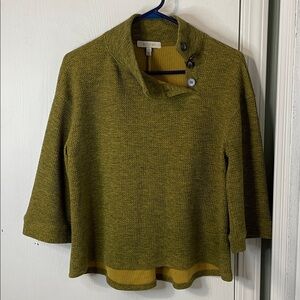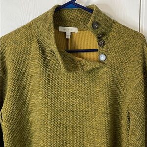 Stay cozy and stylish with this comfy and chic Anthropologie Eri+Ali green pullover sweater/top with a mock turtleneck. Cute buttons on the side of the neck with 3/4 slightly flared sleeves. Size large.