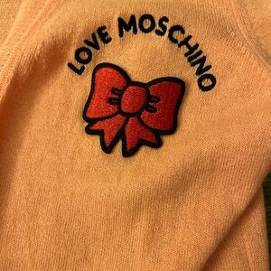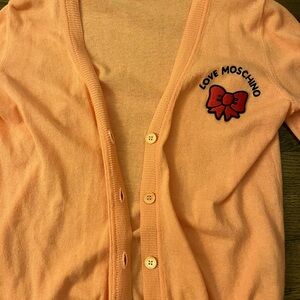 Stylish Love Moschino cardigan in apricot. Features embroidered bow accent.