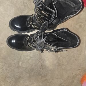 Bold black patent boots with striking studded details. Lace-up design for a fierce look. Look at listing for details. Small scruffy noted where some of the straps are.